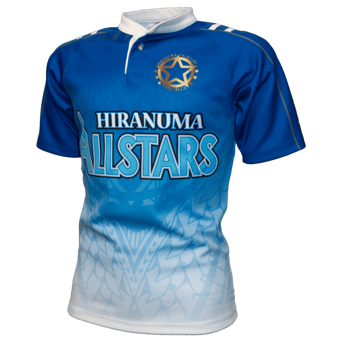 ブルーをベースにマオリ柄の透かしを入れ、さらにグラデーションをかけました。胸の文字ロゴを目立たせ、左胸のロゴにもグラデーションをかけて金色に輝いている様子を表現しました。