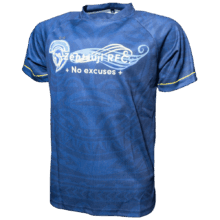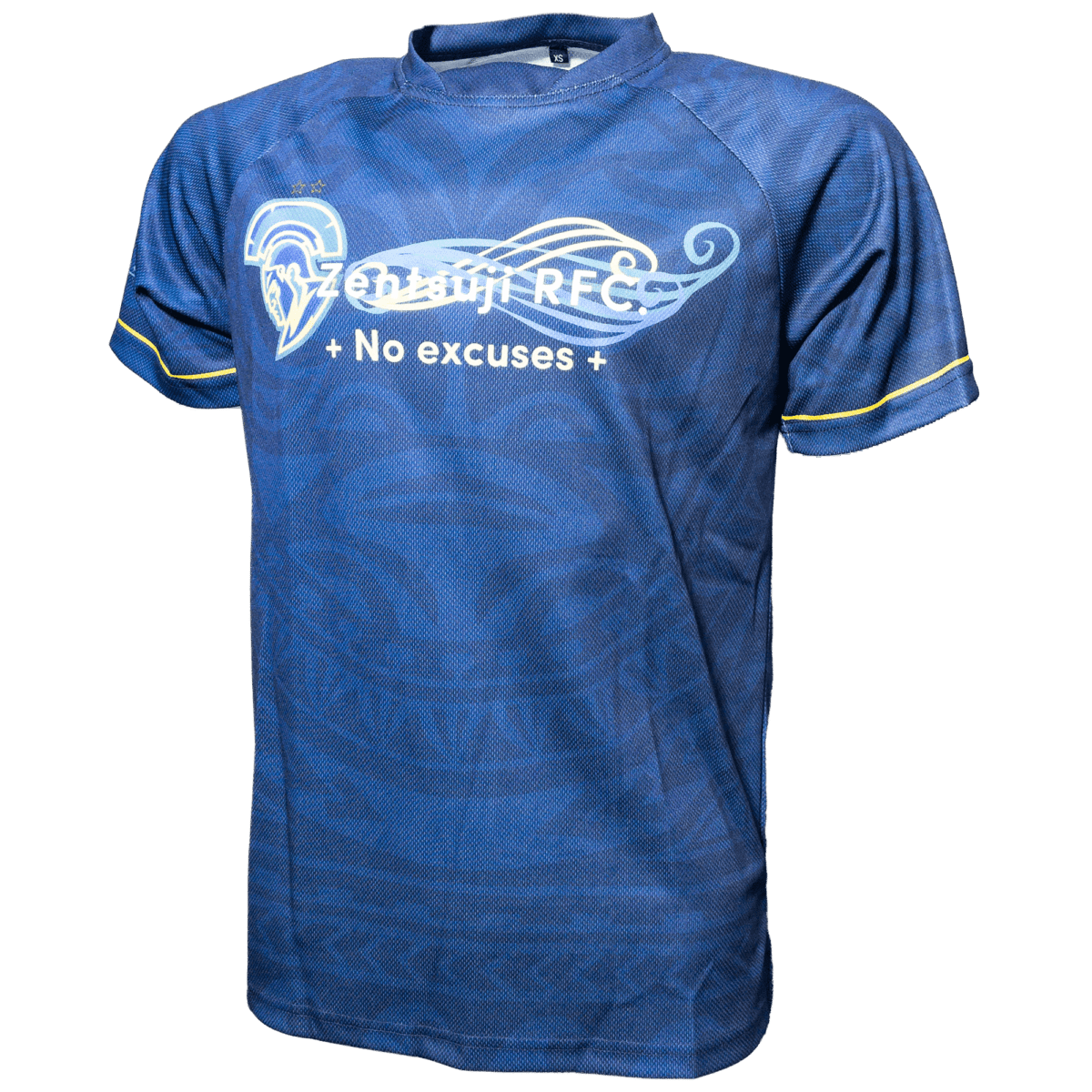 マオリ柄を透かしで入れ、3パターンのチームロゴを前面、背面、袖に入れました。袖に細くいれた黄色いラインがロゴと調和しています。