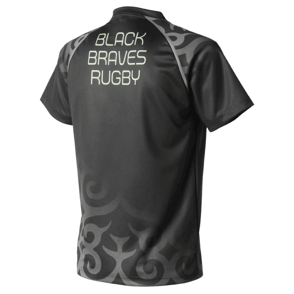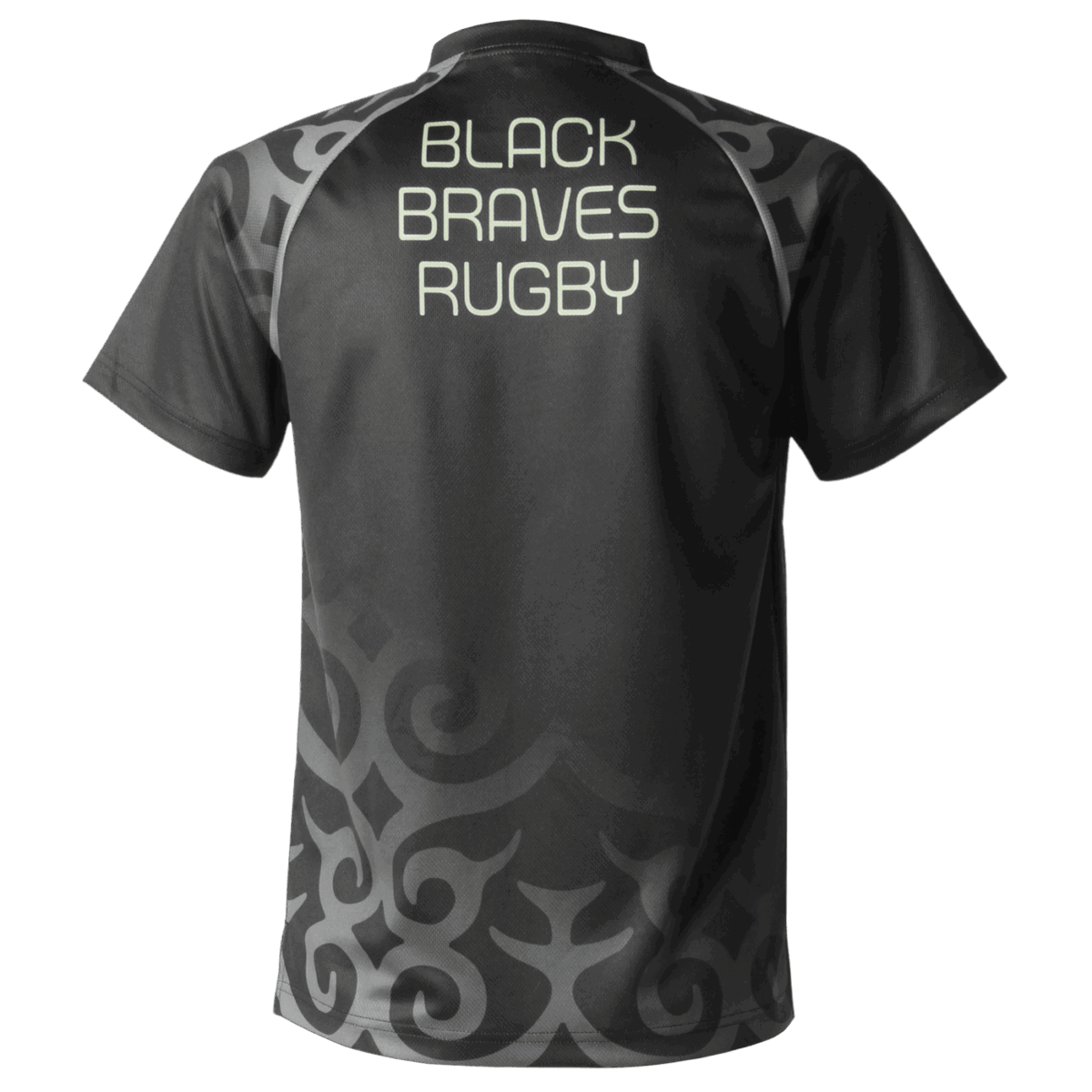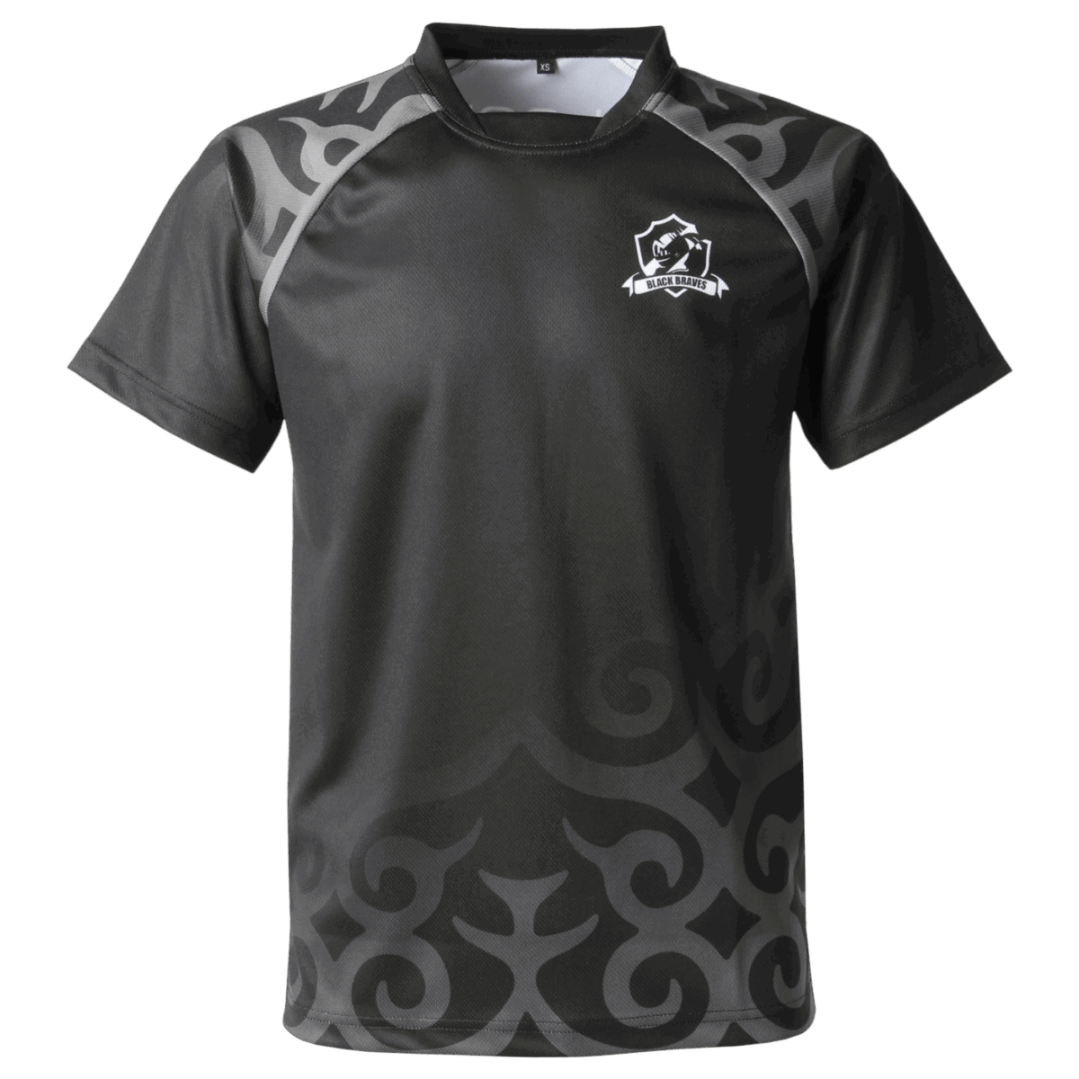 ラグビージャージとお揃いのデザインで製作したウォームアップTシャツです。背番号の代わりにクラブ名をテキストで入れるデザインとなっています。