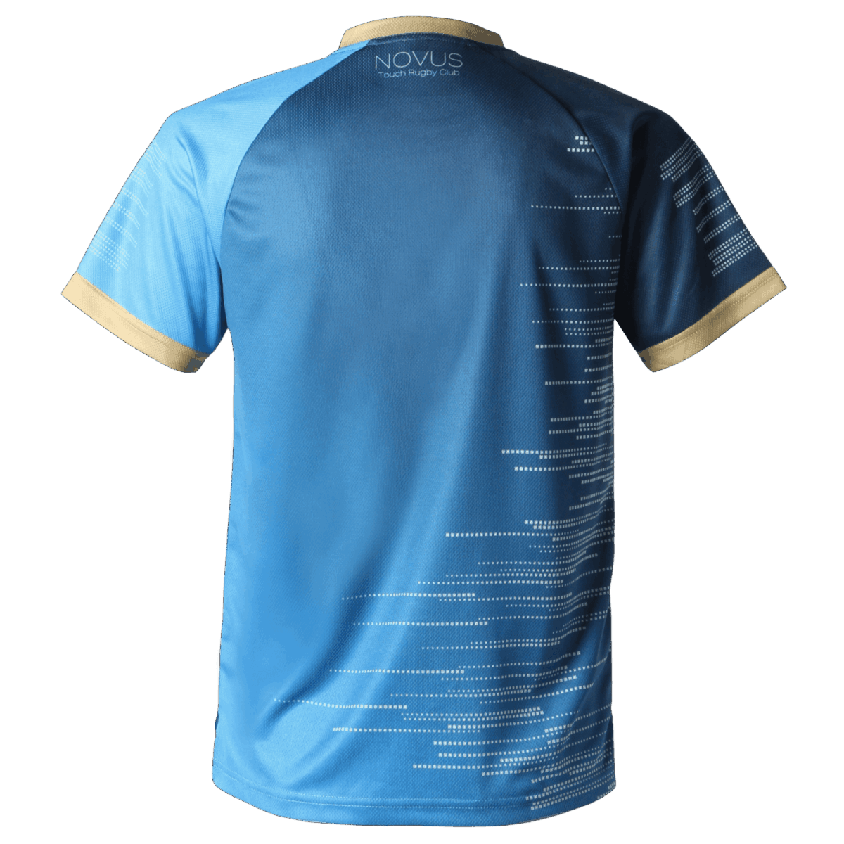 多様な青色を使用し、脇に入れたテキストはスピード感のあるフォントを採用しています。一転、背面首下のテキストは細いフォントで品のある印象をウェアに与えています。