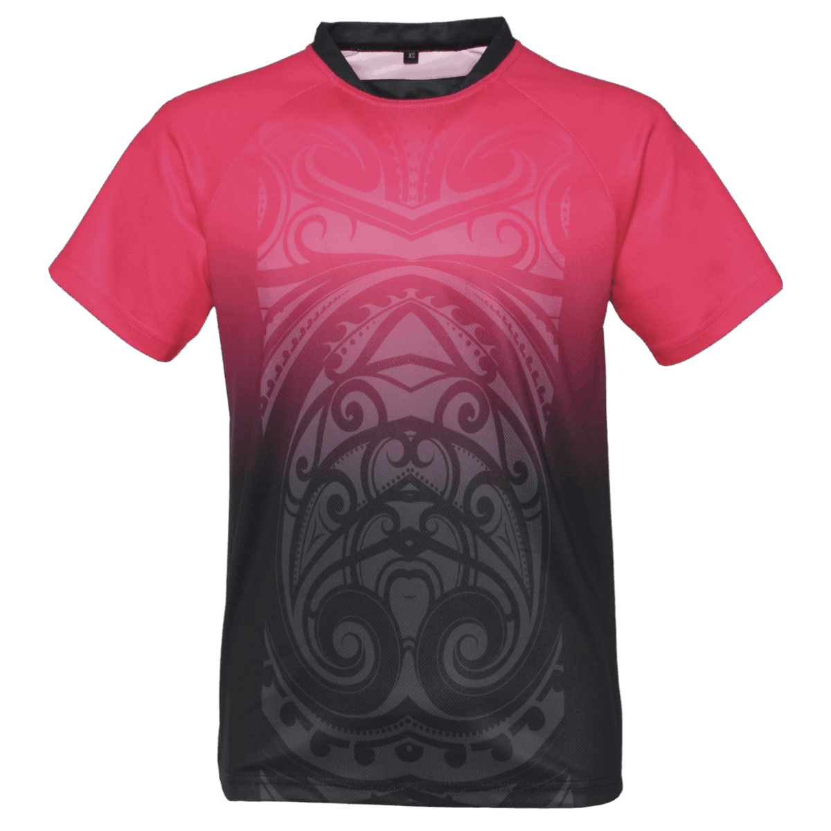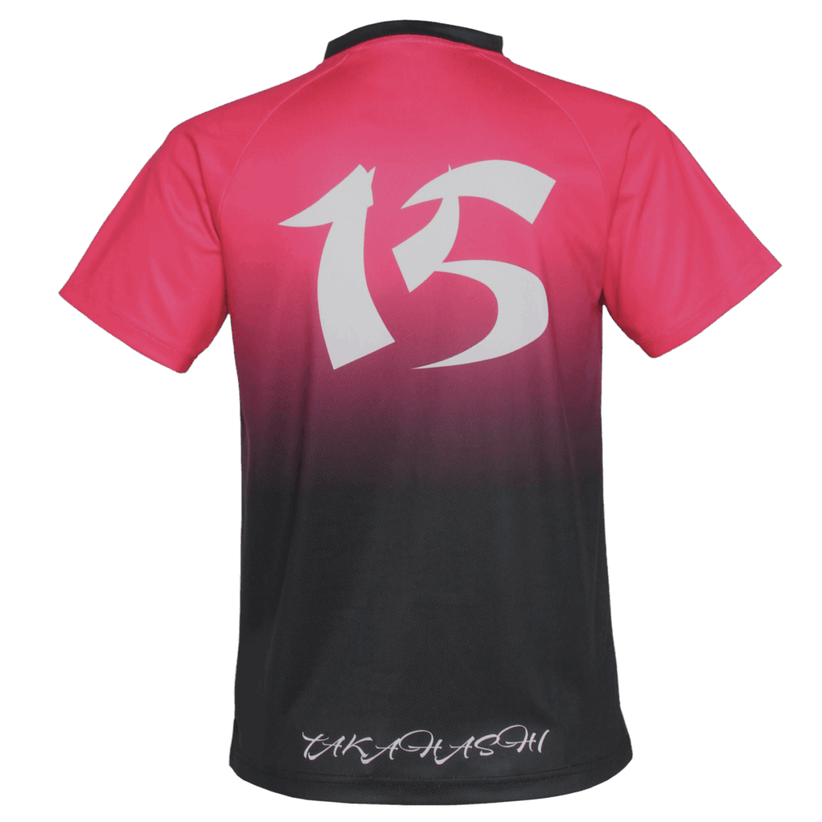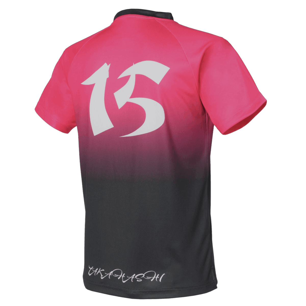 ピンク色から黒色にグラデーションをかけ、さらに透かしでマオリ柄入れたウォームアップTシャツです。背番号も特徴あるフォントで目を引きます。