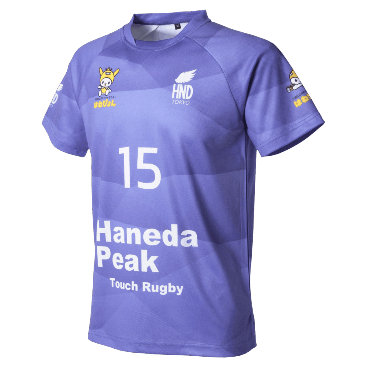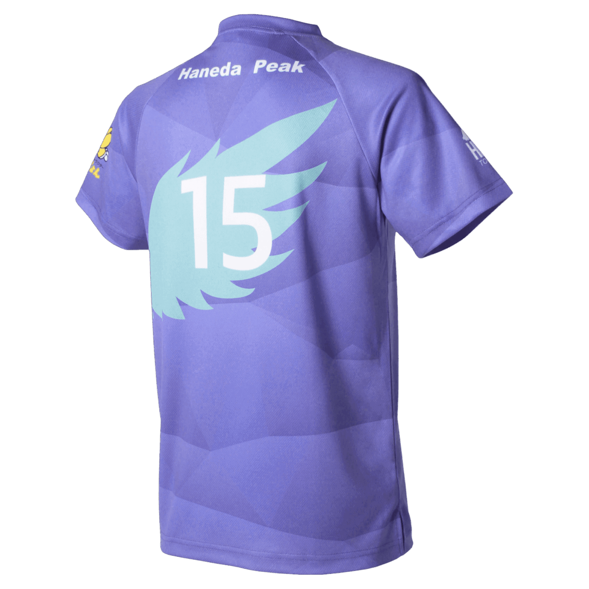 大田区の公式キャラクターを右胸と左袖に入れたウォームアップTシャツです。他にもテキストやロゴ、背番号も入れて要素の多いオリジナルウェアになっています。
