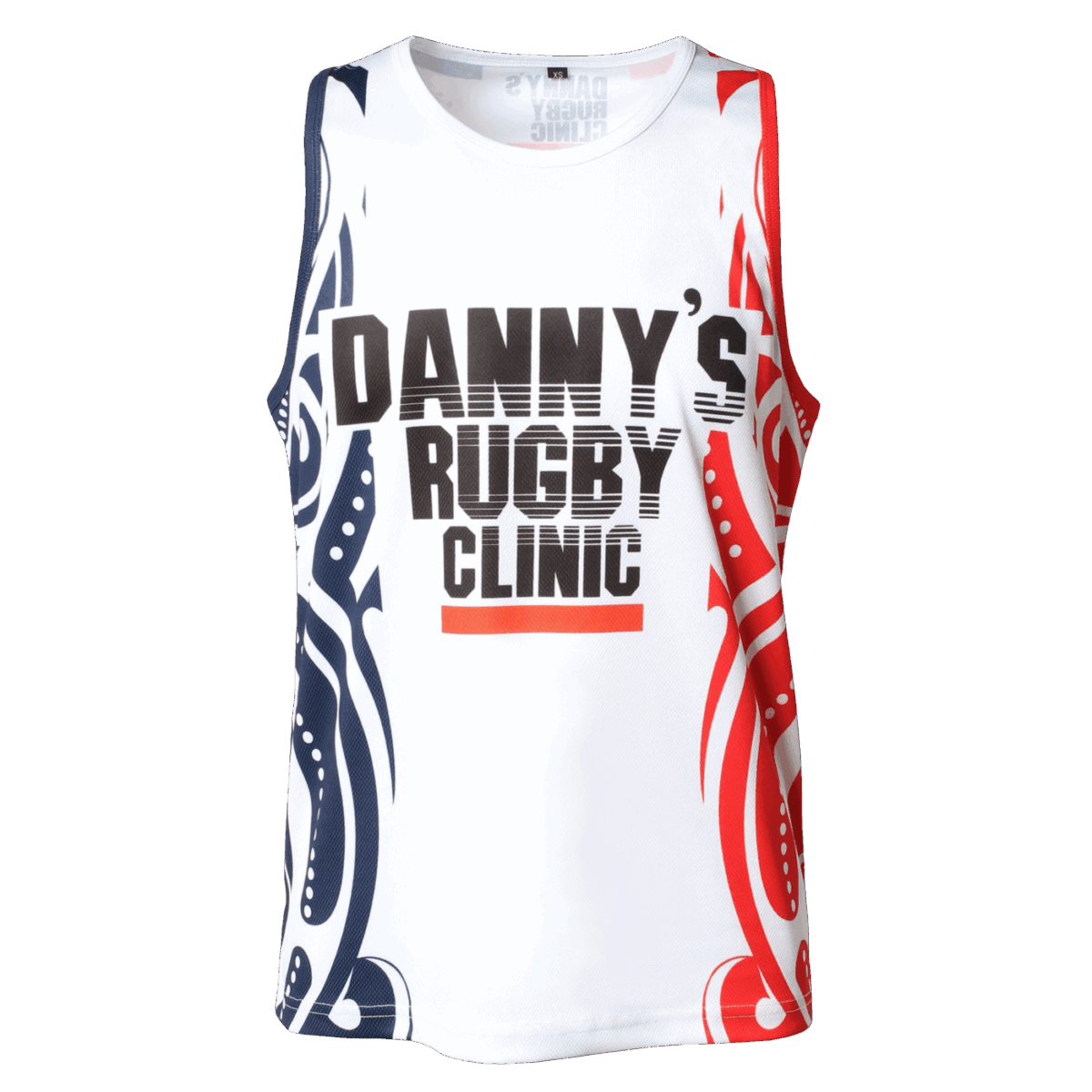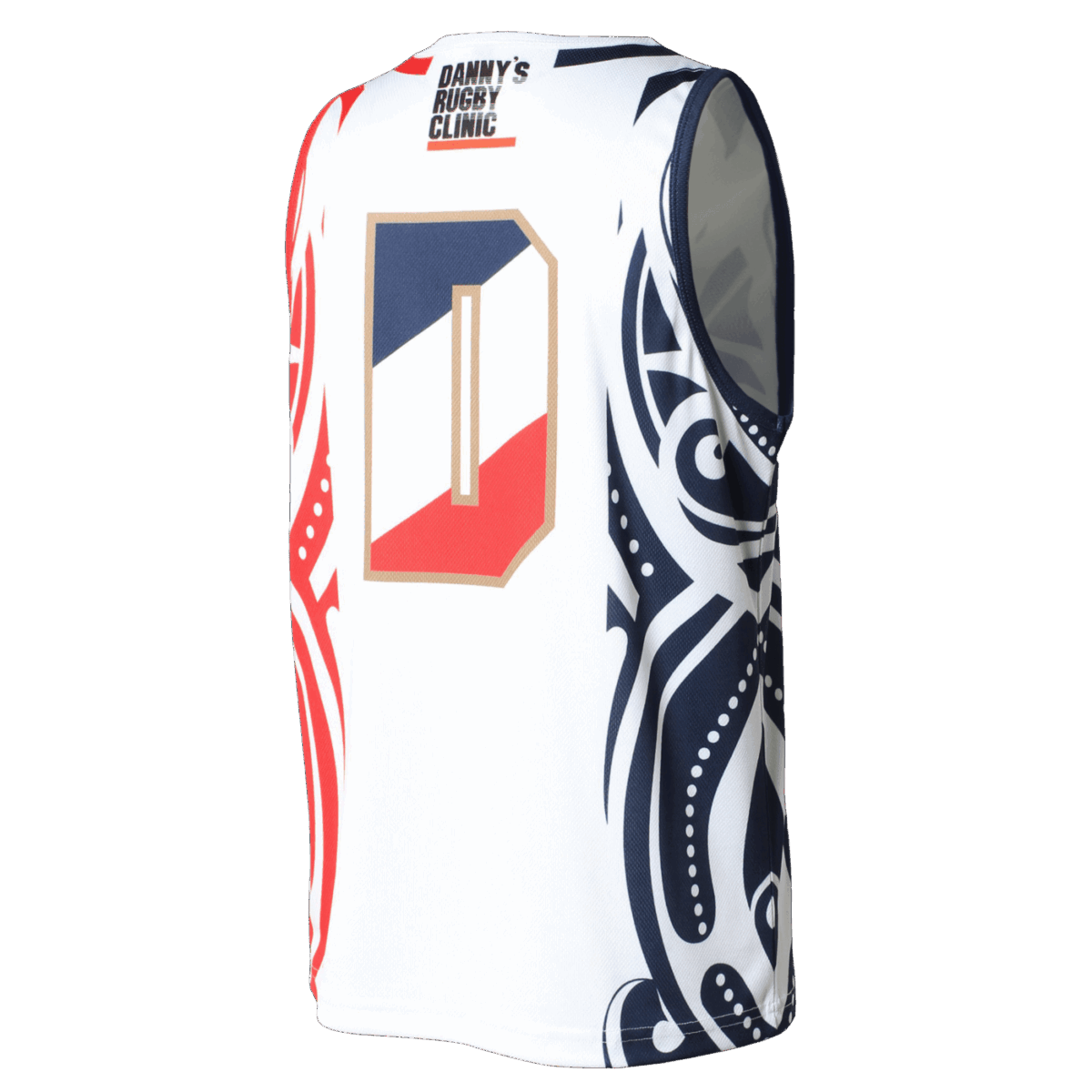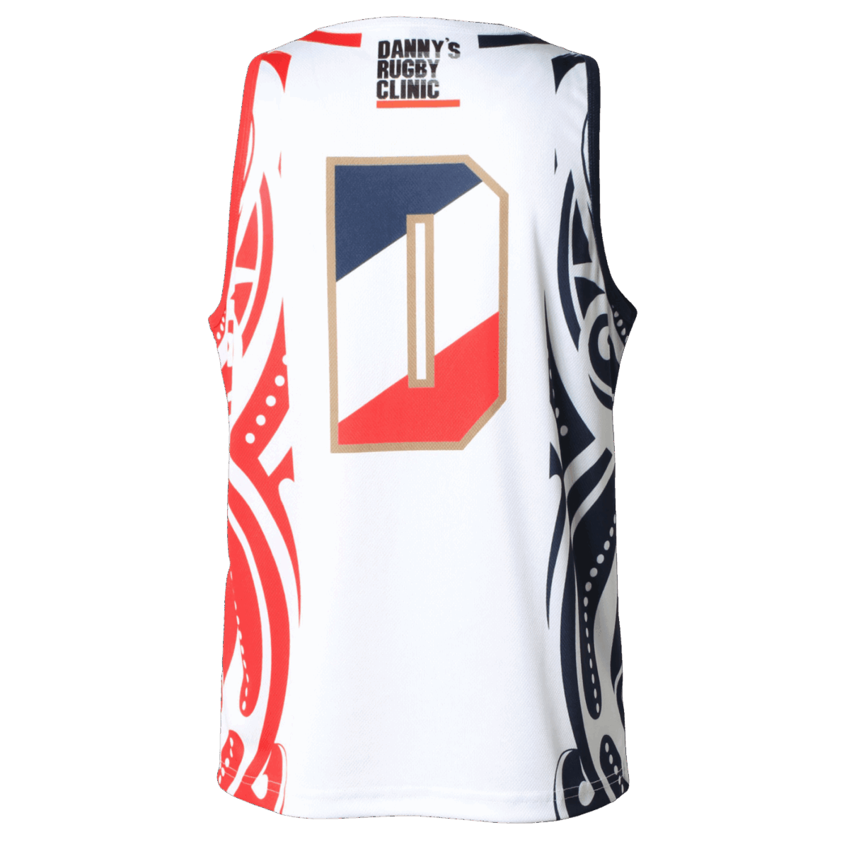 紺色と赤色のトライバル柄に白色の帯を縦に加えたインパクトのあるデザインのシングレットです。背面の「D」も3色で構成され、派手ながらもまとまった印象のデザインになりました。