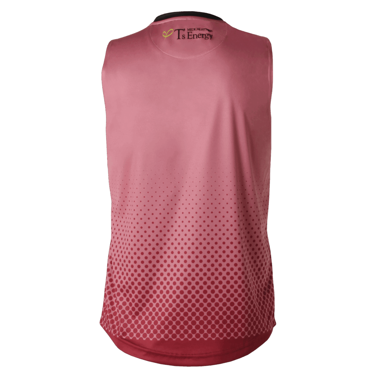 薄めのピンク色に濃いピンク色のドット柄を配置したタンクトップです。前面のテキストロゴのフォントが特徴的で、背面の首下にもさりげなくロゴを配置しています。