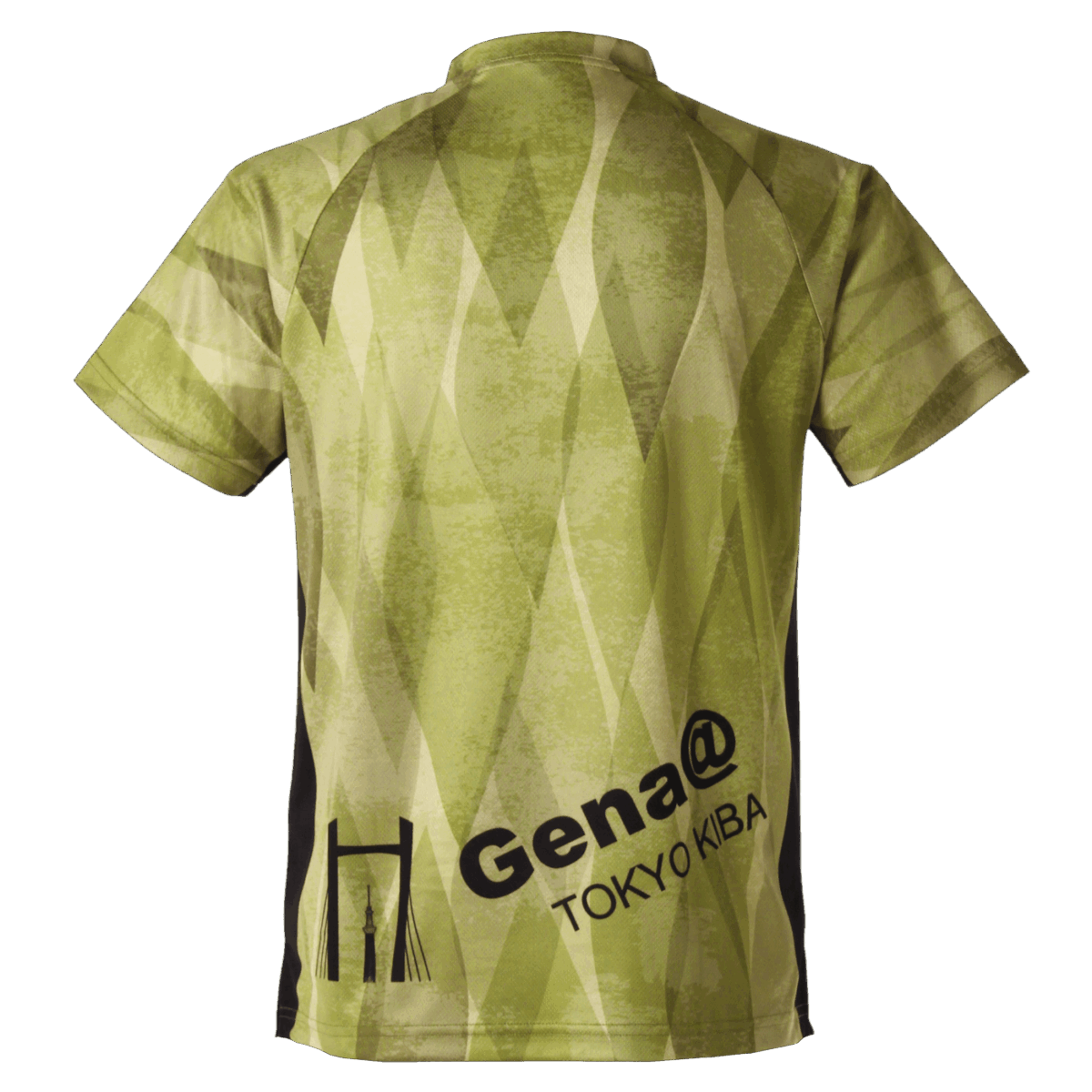 金色のベースに、グラデーションをかけた木の葉状の柄を入れたウォームアップTシャツです。胸部分と背面裾部分にテキストや柄をプリントしています。