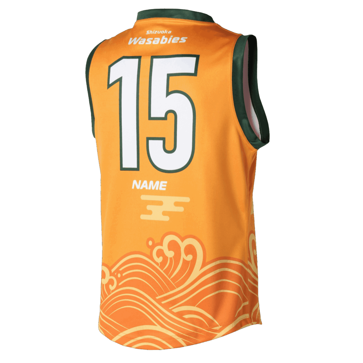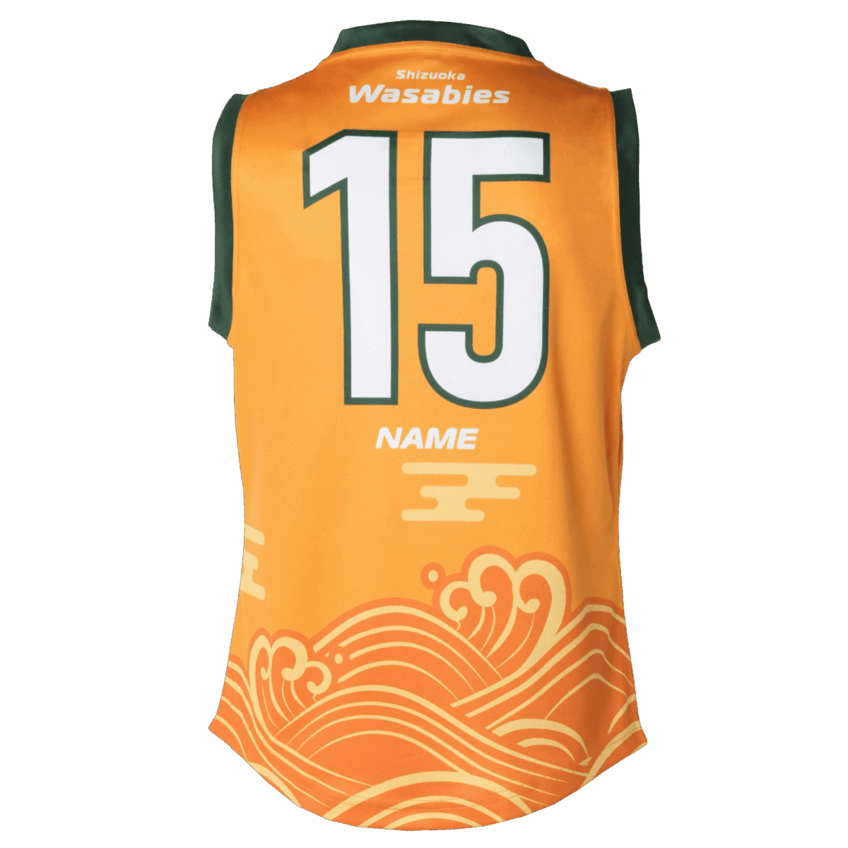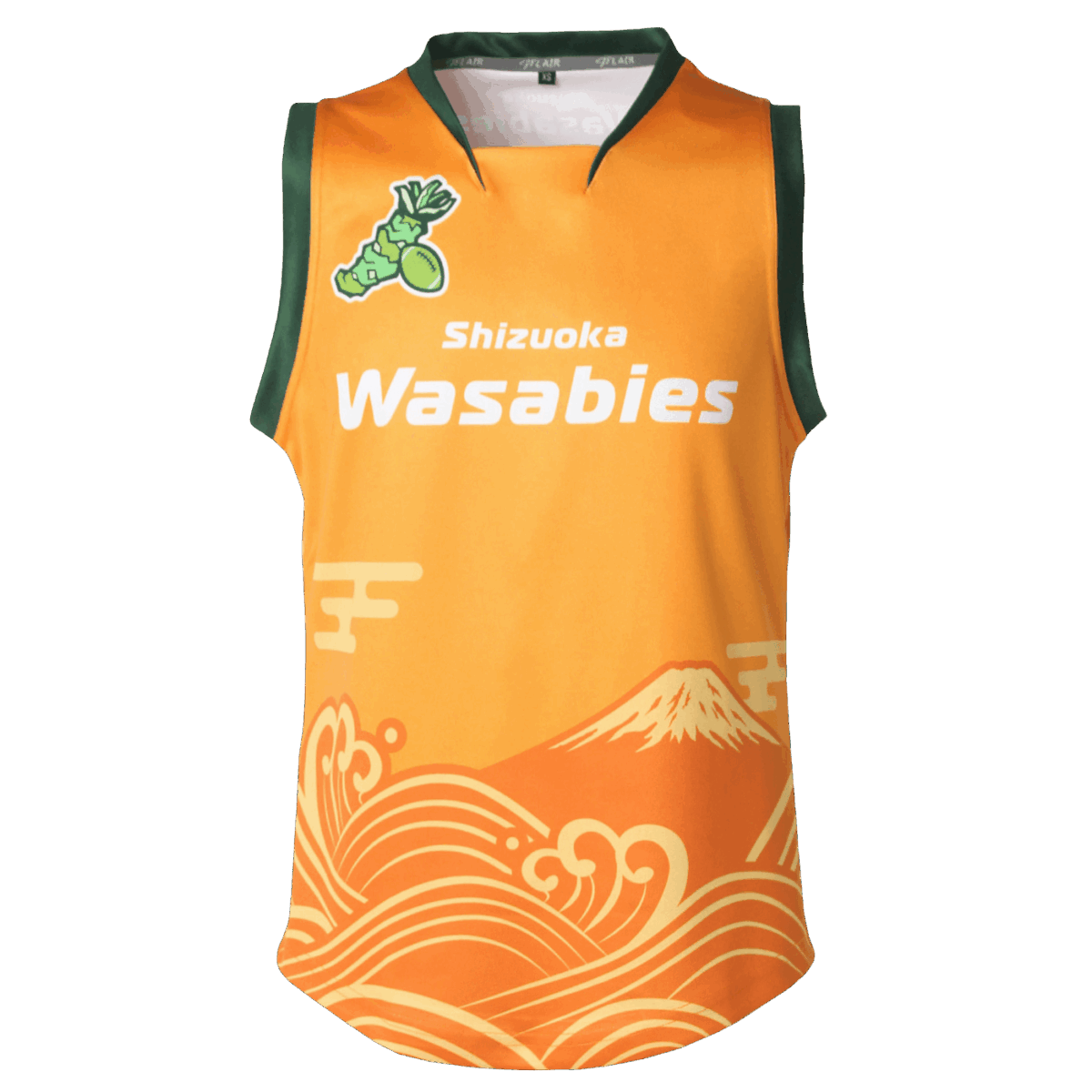 明るいオレンジ色にクラブ名にもなっている山葵をイメージしたグリーンを追加したAFLジャージです。静岡のクラブらしく富士山を入れたジャージ下部は個性あるデザインで、ジャージ上部はロゴとテキストでまとめてオフィシャル感を出すことに成功しています。