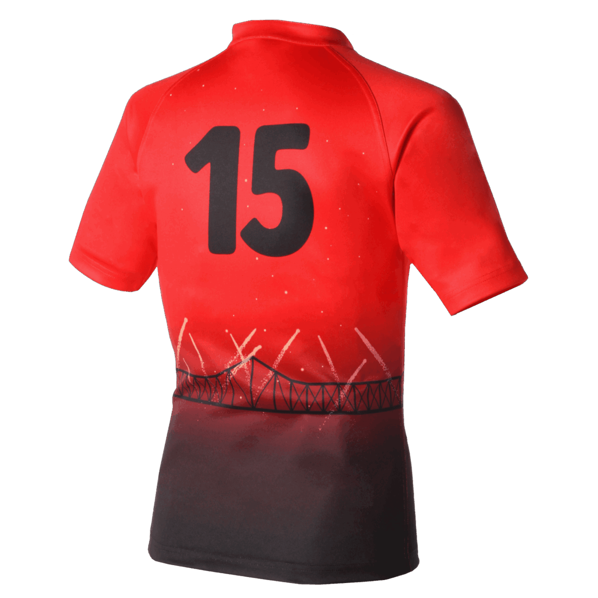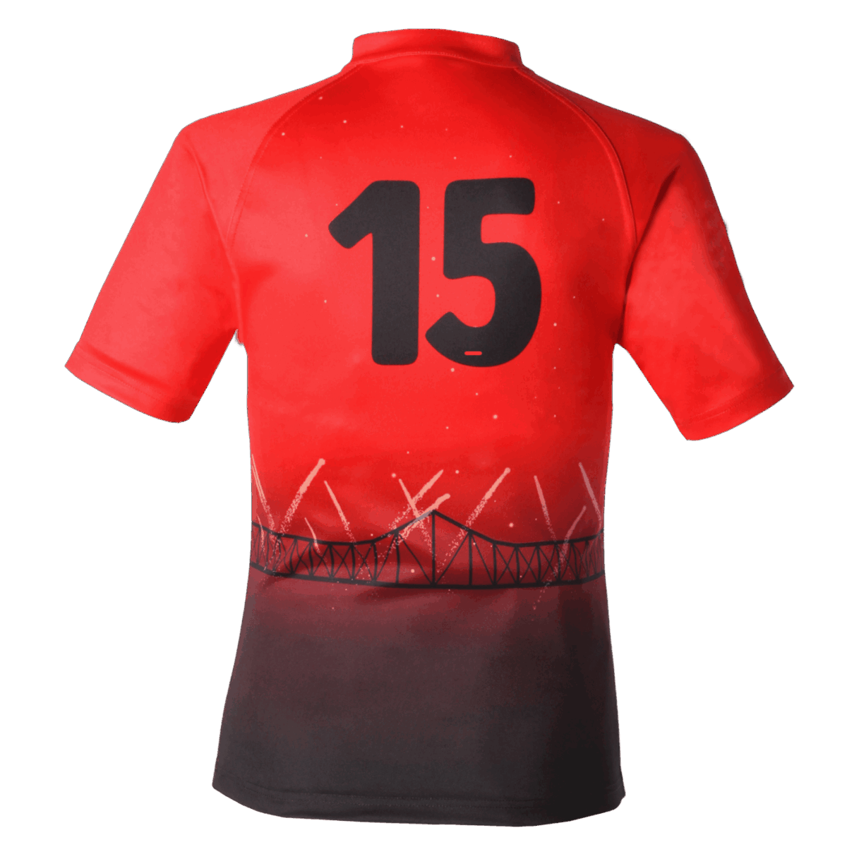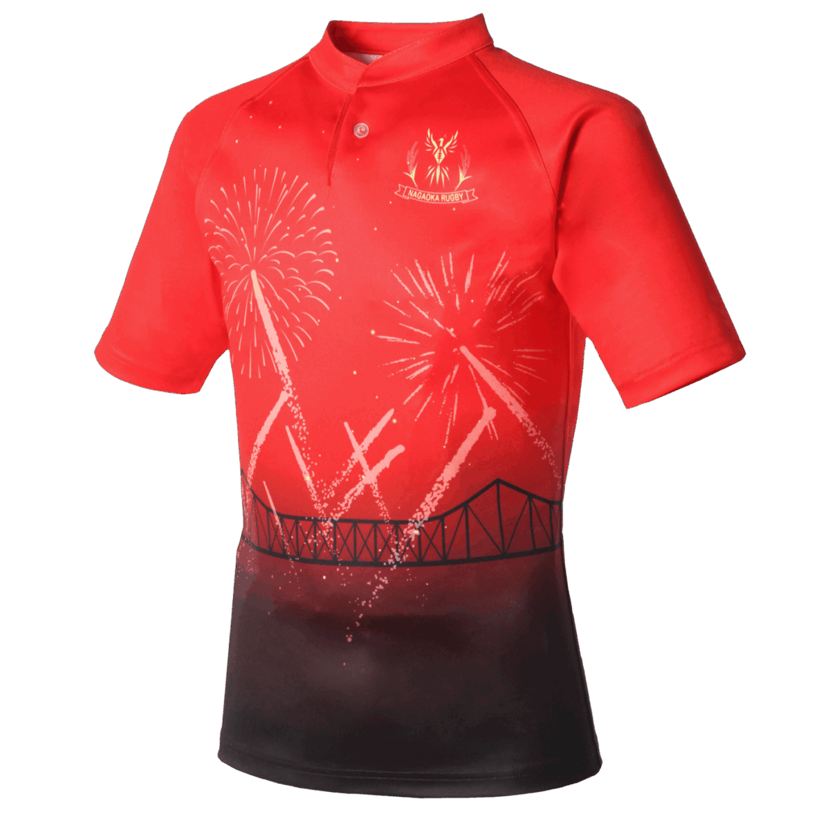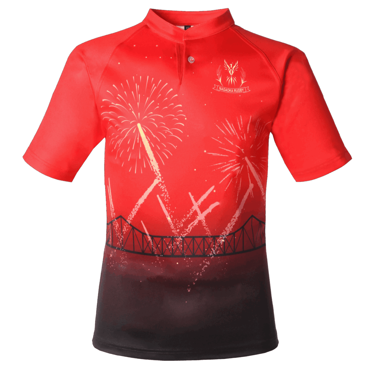 赤から黒へグラデーションをかけたベースデザインのラグビージャージです。地域の特徴的な橋と花火の柄を入れて絵画のようなラグビージャージになりました。