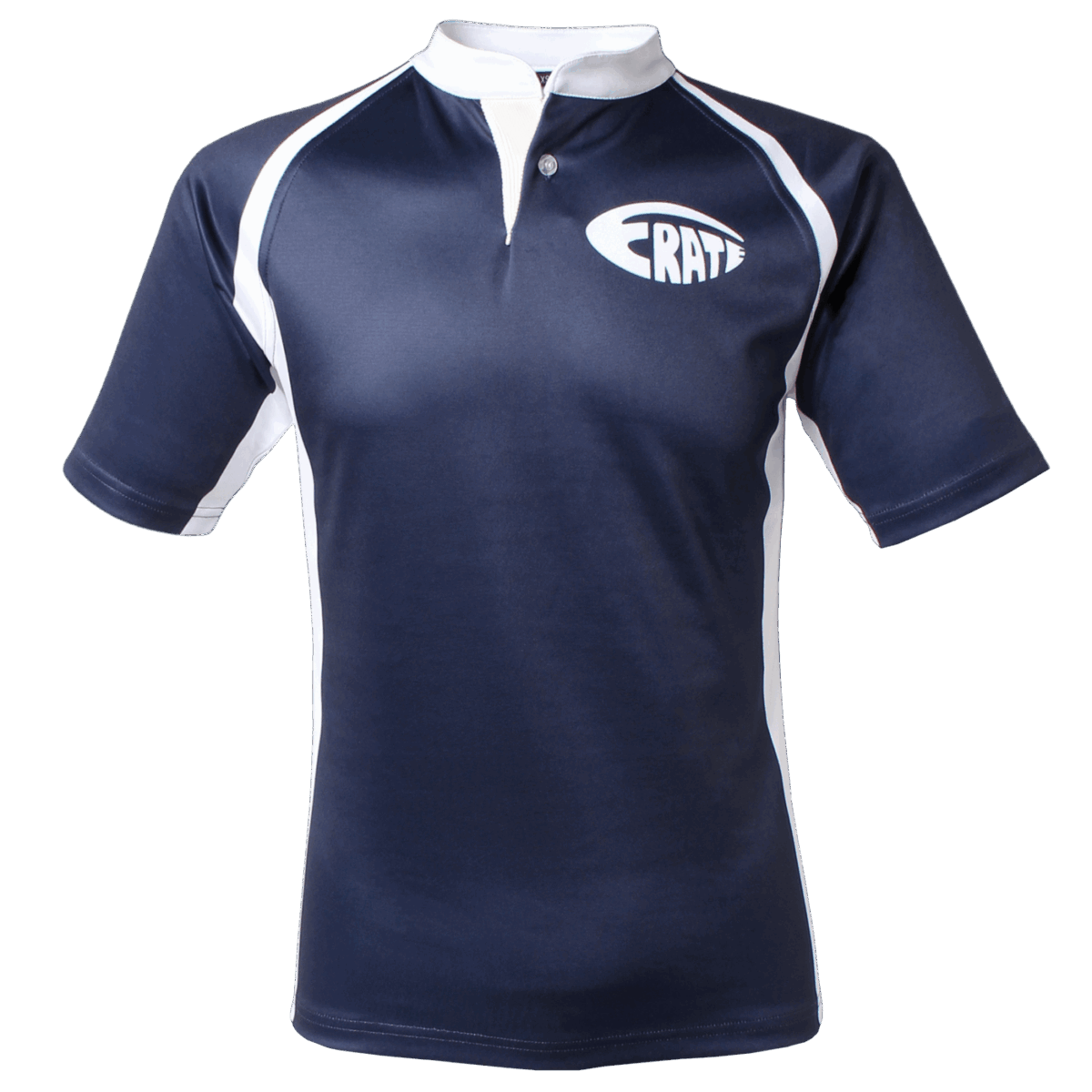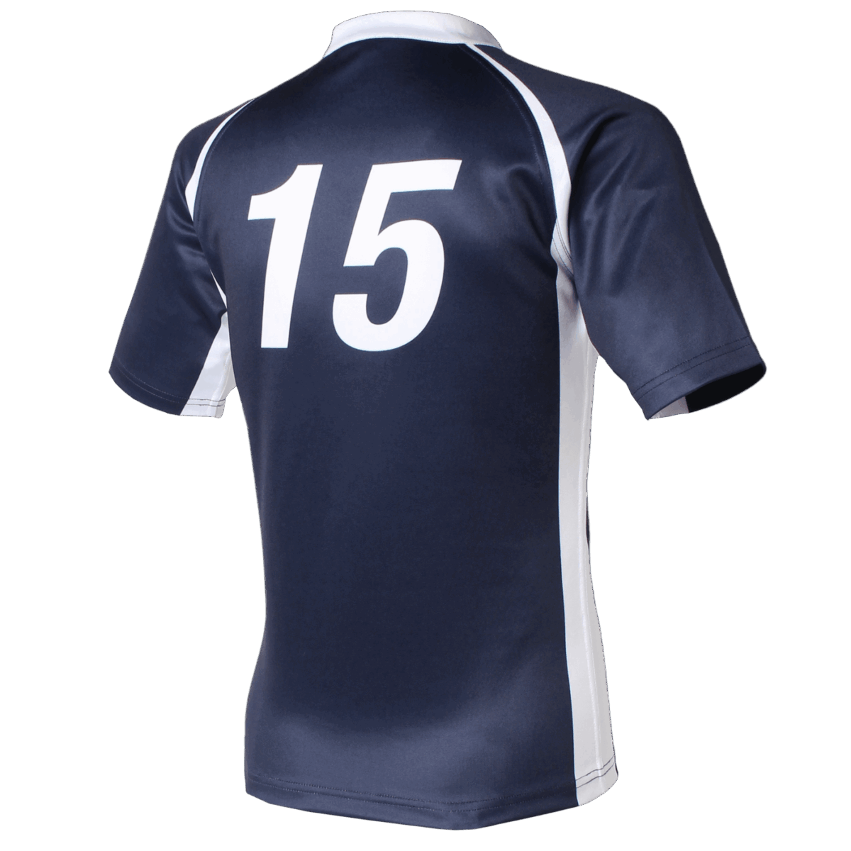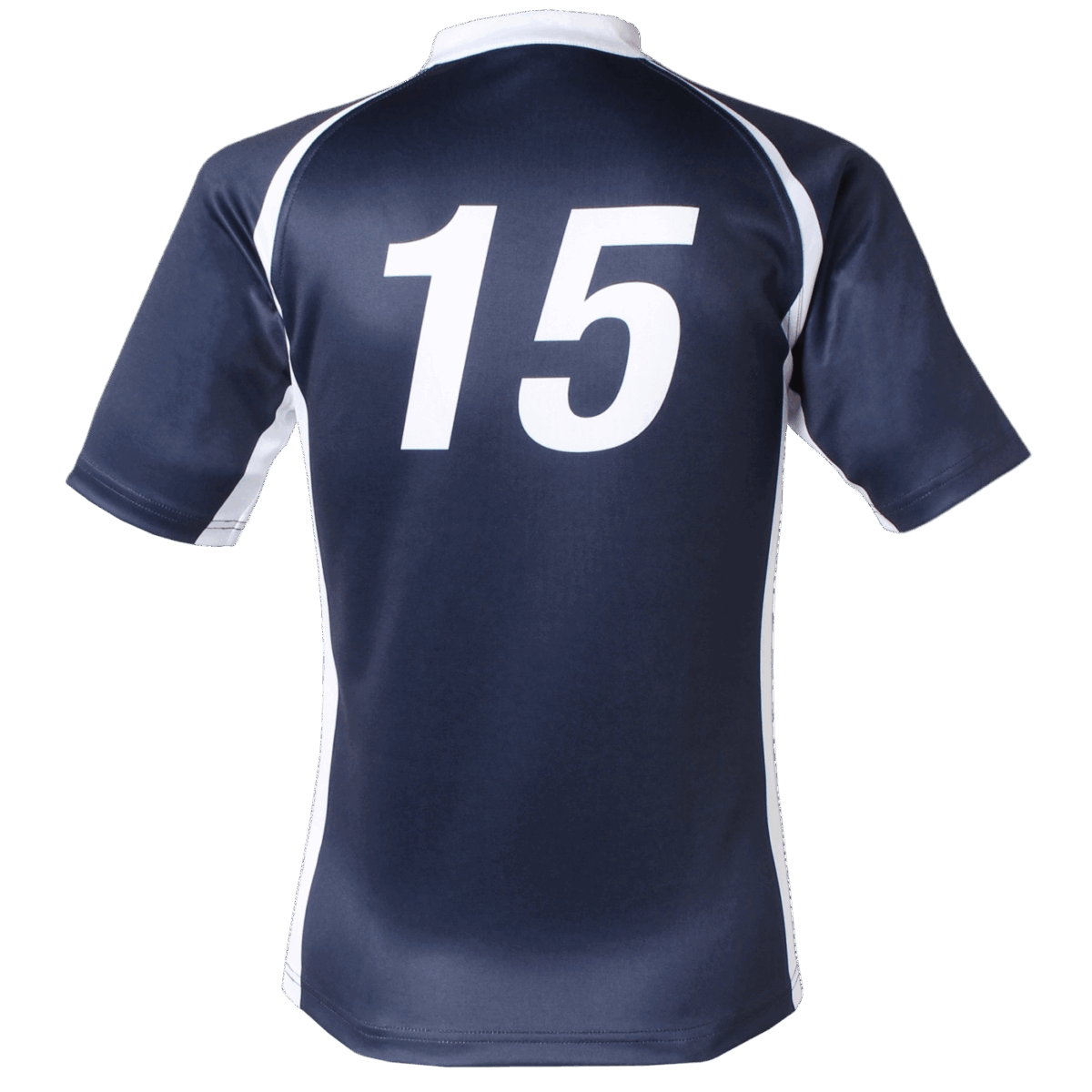 紺色ベースに白いラインが映えるラグビージャージです。左胸のロゴと背番号のシンプルな構成ですっきりとしたデザインになっています。