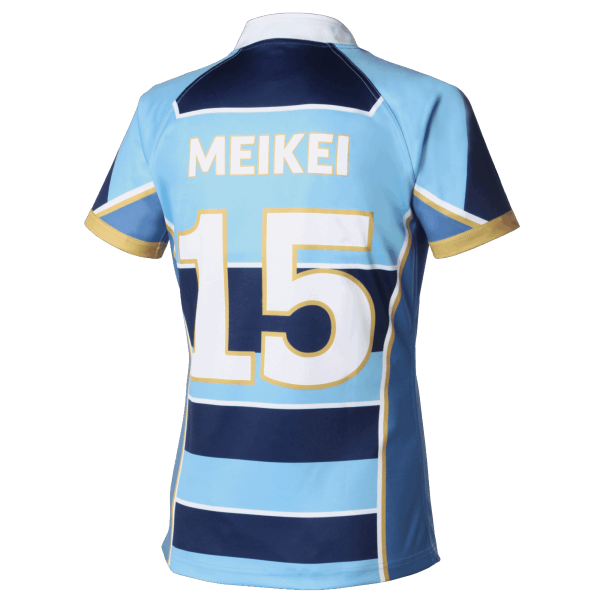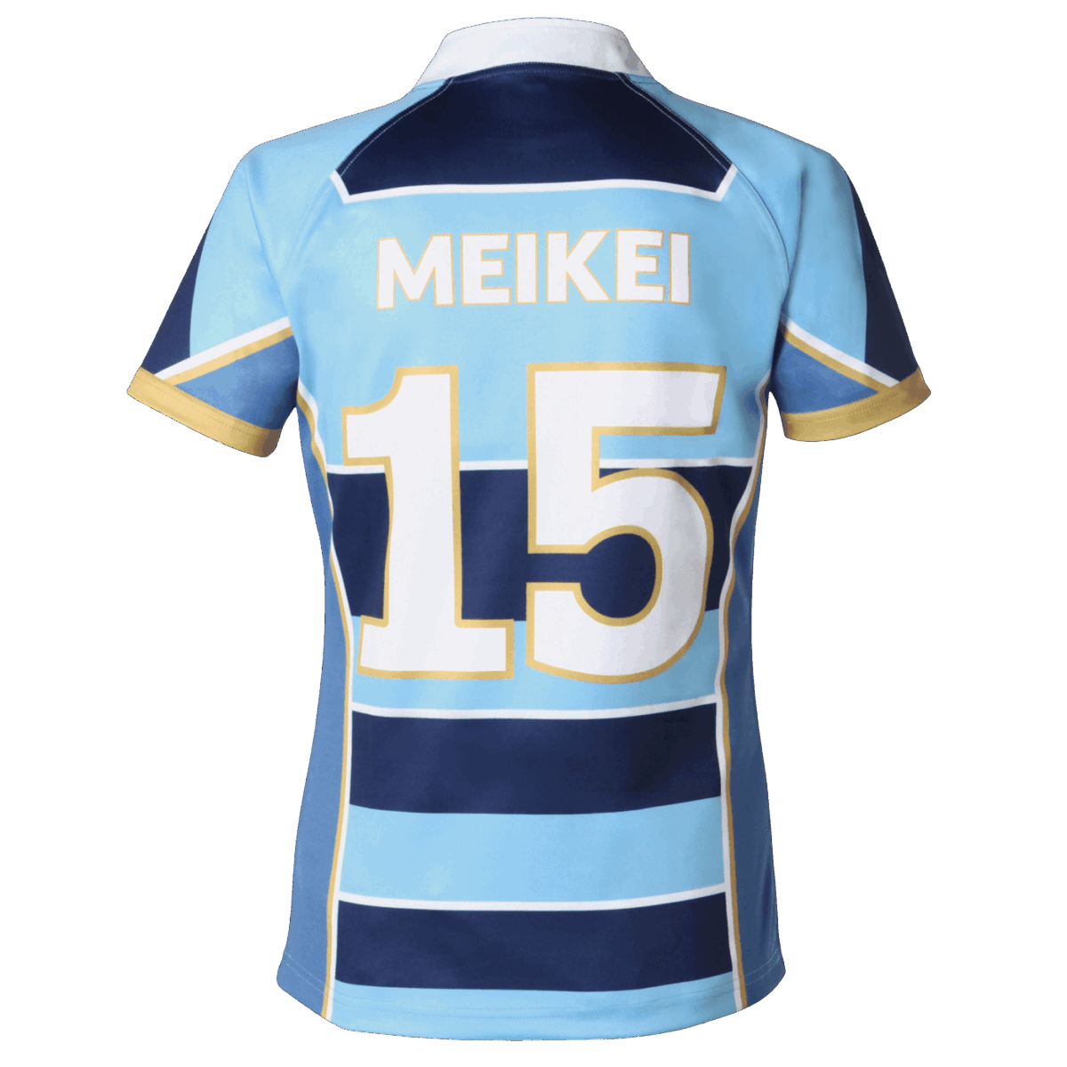 3色の青色に加え、白色と金色も配置したラグビージャージです。様々なラインと色が含まれるにぎやかなデザインになっています。