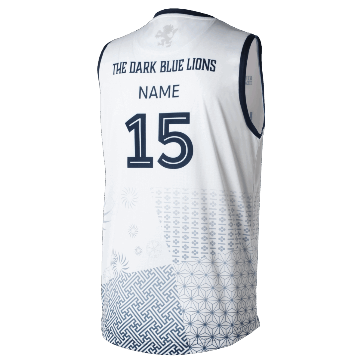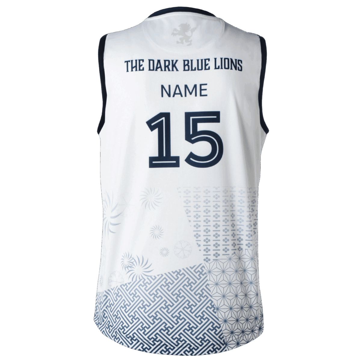白色ベースに紺色で各デザインを配置したタンクトップです。ボディー部分には4種類の和柄を入れ、両面にテキストとロゴをバランスよく配置しています。