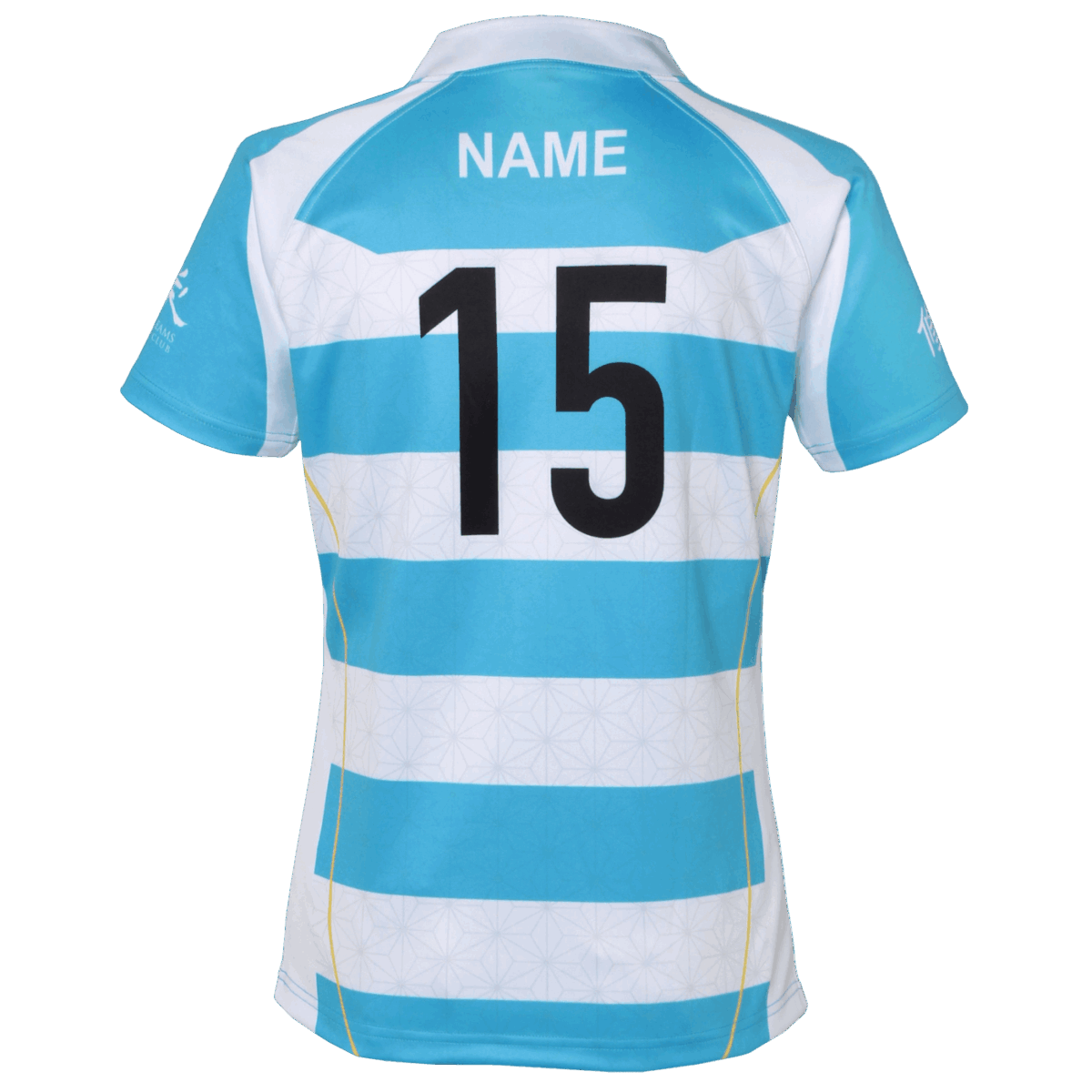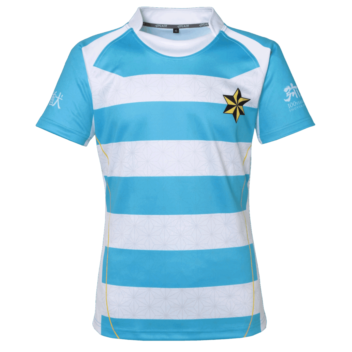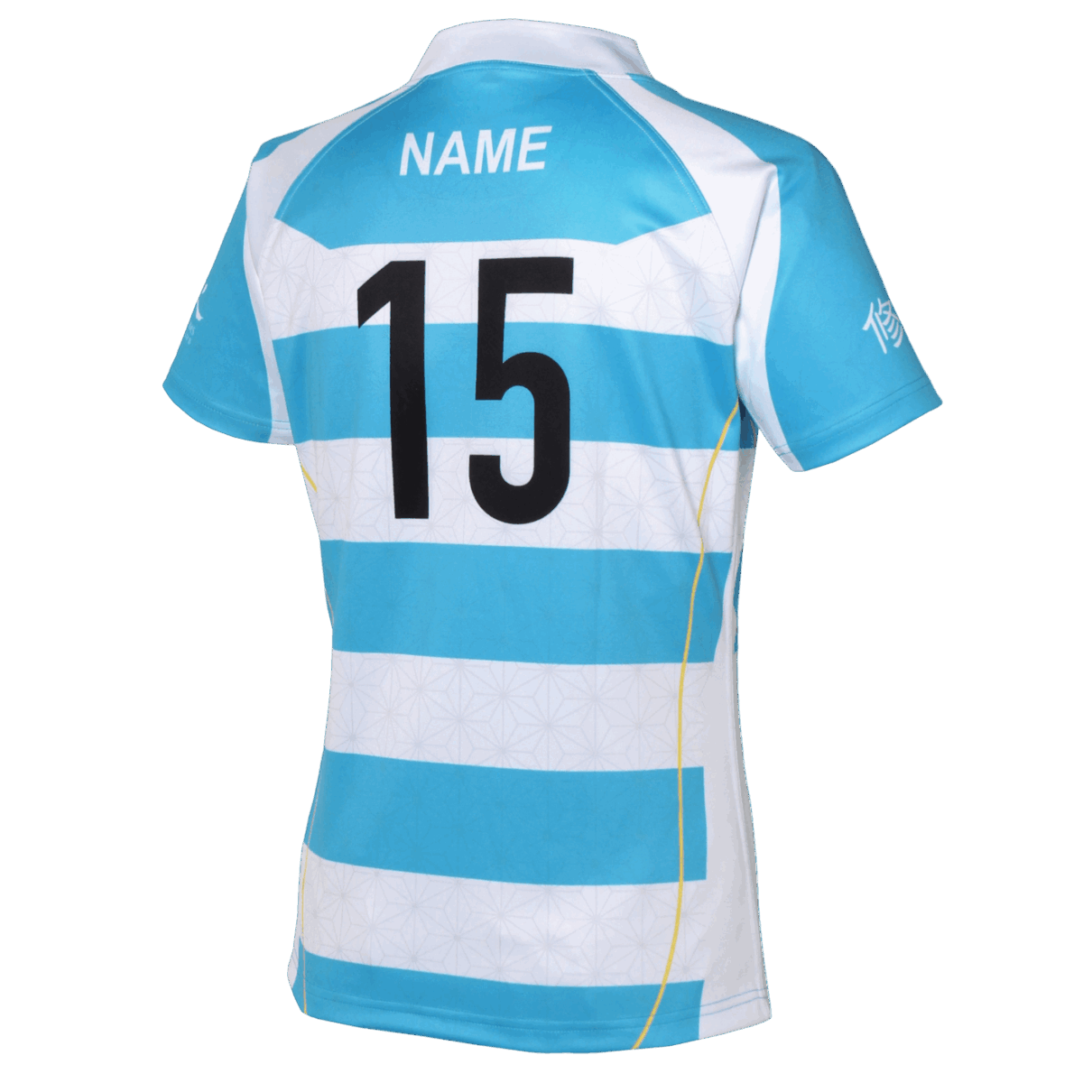 青色と白色のボーダーに和柄をいれたラグビージャージです。左胸には星形のロゴ、両袖にもロゴとテキストを入れており、ボディー部分の黄色いラインが目を引くデザインになっています。